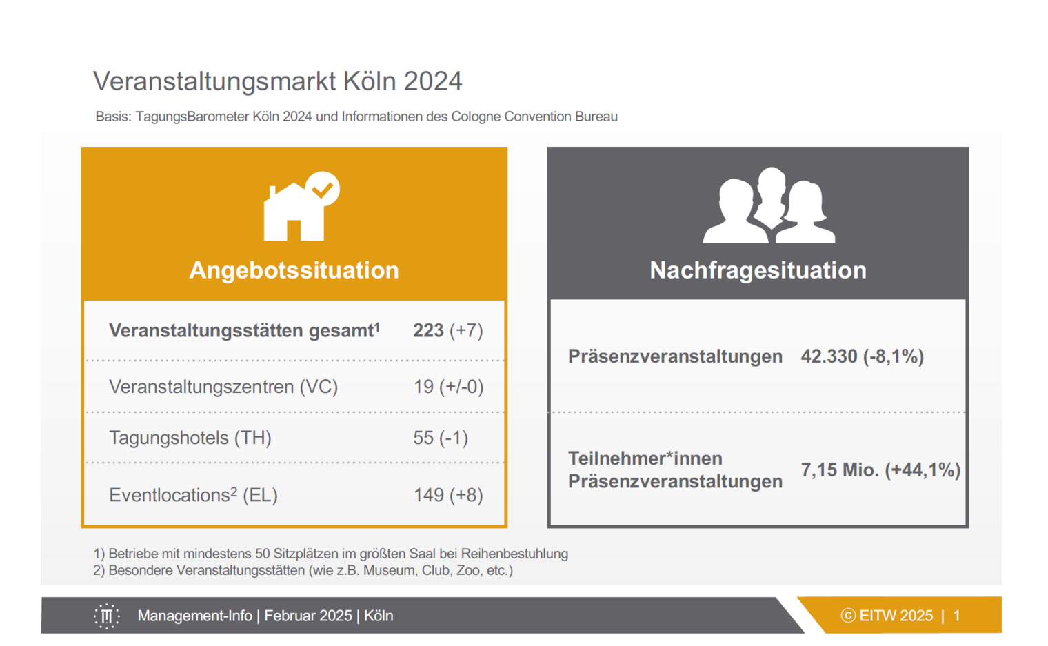Kölner Tagungsbarometer 2025: Gesamtzahl der Veranstaltungsorte: 223, davon 19 Veranstaltungszentren, 149 Veranstaltungsorte und 55 Tagungshotels mit 42.330 Präsenzveranstaltungen und 7,15 Millionen Besuchern